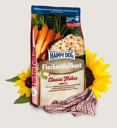 Door een in Europa uniek ontsluitingsproces ontstaat sinds meer dan 40 jaar de zeer goed verteerbare fijn gelaagde-vlokkenvoeding “Happy Dog Vlokken Compleetvoer”.